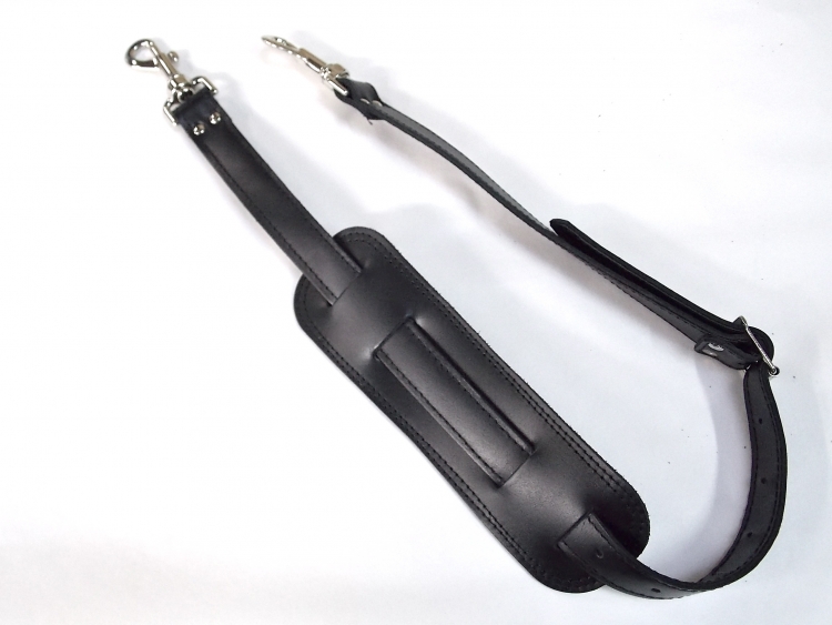 Bandoulière en cuir avec patte d'épaule en cuir. Reglage multiple par boucle en métal. 2 mousquetons nickelés