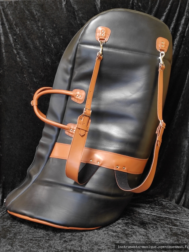 Housse luxe tout cuir noir pour Tuba sac à dos anti-choc hyper rembourrée, anse et système sac à dos en cuir. Double fond cartonné avec pieds de protection pour la pose à terre. Intérieur tissu polaire uni. Mousse épaisseur 2 cm.